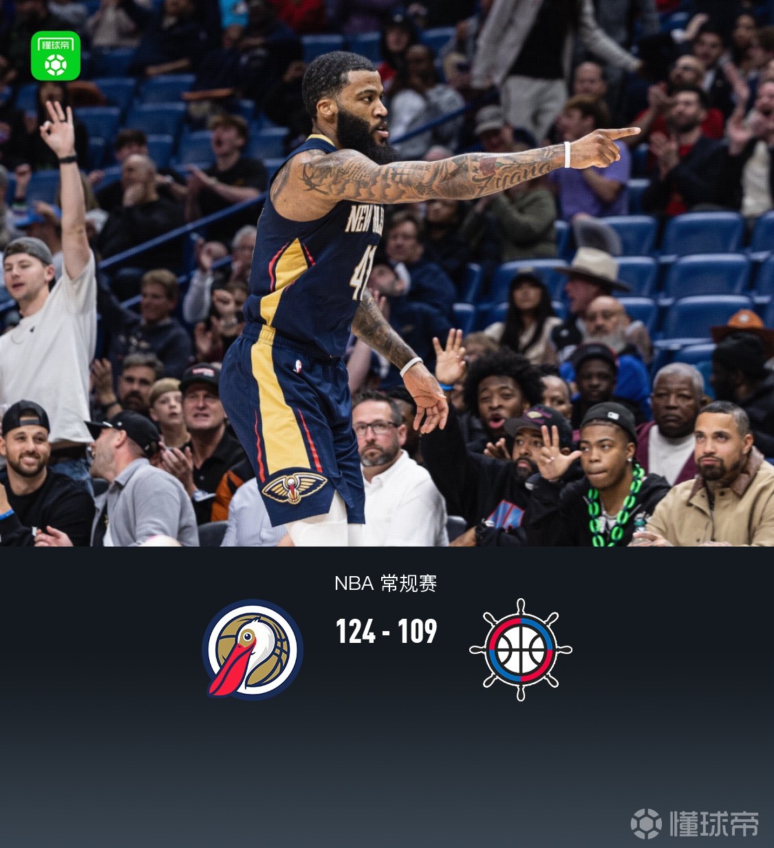 第四节鹈鹕德章泰-穆雷拿下8分,快船达里厄斯-加兰拿下6分,最终鹈鹕124-109战胜快船
